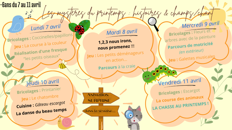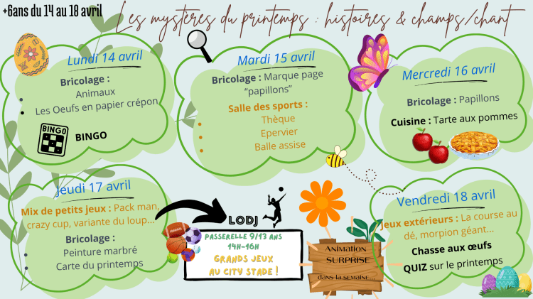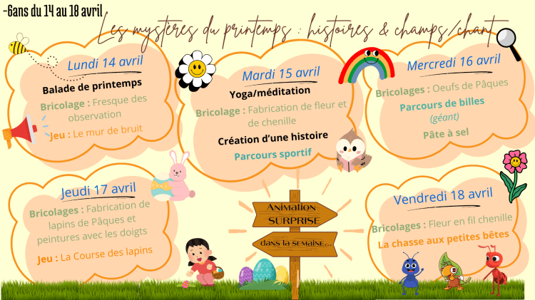 Sur chaque période de vacance l’équipe d’animation travail et prépare en amont un programme d’activités dédiés par tranche d’âge. Un programme pour les – de 6 ans et un programme pour les plus de 6 ans. Ce programme reste non exhaustif